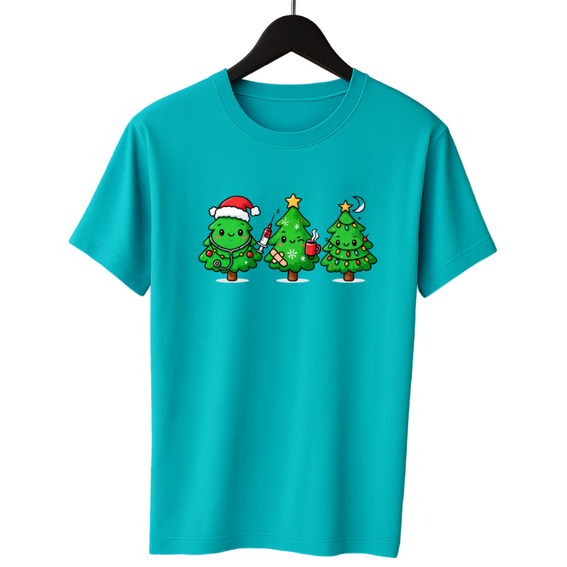 Deze drie kerstboompjes brengen humor, warmte en zorg samen in één vrolijk shirt.